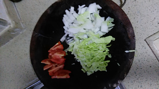 6.先放白菜根部和西红柿,煮至开后再放青菜叶,最后试下味道。