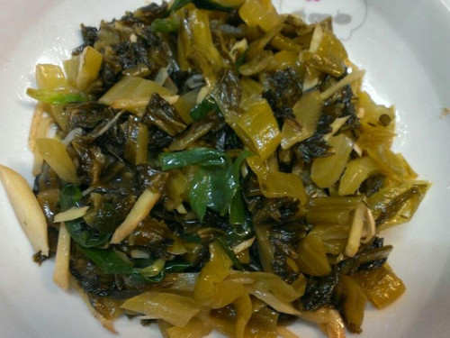 2、热油锅,酸菜、姜、葱下锅炒香。