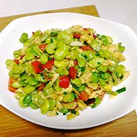 少许油烧热下蒜片红椒炒香,调小火下香葱炸好的蚕豆,鸡蛋碎。