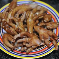 鸡爪500克、老抽几滴、白醋一勺、大蒜5个、草果2个、八角两个、嫩姜一个、干辣椒几个、油600毫升、辣椒粉一勺、葱花适量