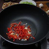 下入蒜末和红椒丝翻炒。