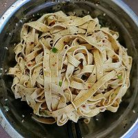 食材: 千张2张、香葱1根、蒜瓣4个、辣椒面适量、芝麻少许(可不放)、食用油适量、盐适量、鸡精少许、生抽适量、蚝油少许 步骤1: 葱切段,蒜切末,千张叠好切小条。锅内烧水,水开后放入千张焯水一分钟。 步骤2: 焯好水的千张过凉水后放入盆中,将葱花、蒜末、辣椒面、白芝麻、盐放在千张上面。 步骤3: 炒锅烧干放入适量食用油(稍多点没事),烧至冒烟后关火,将热油浇到调料上。加入鸡精、蚝油、生抽拌匀即可。 步骤4: 成品