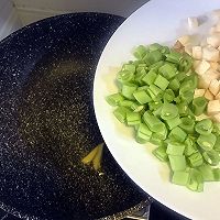 薏米20克、黄豆20克、红花芸豆20克、奶花芸豆20克、杏鲍菇120克、豆角100克、千张5块(10cm2)、蚝油5毫升、鸡精2克、生抽10毫升、黑胡椒粒2克、味椒盐1克、香菜2颗、姜片5克