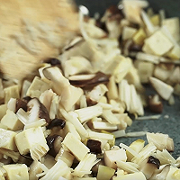 ?炒锅放入猪油1勺烧热,下蒜末炒香,再放入水发香菇丁、金针菇、豆腐丁、鲜笋丁各50g炒香