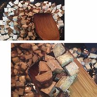 豆干切丁小火慢炸,我放的油少慢慢煎的,煎豆干的过程准备别的食材。煎成比较干嚼起来有质感的时候盛出来。