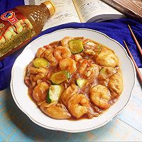 虾仁200g、油面筋8个、料酒1勺、淀粉0.5勺+2勺、老抽1汤匙、生抽2汤匙、糖2小勺、盐少许、水小半碗、蒜2瓣、姜2片、大葱一小段、黄瓜(适中长短)1/3根、八角2个、多力花生油适量