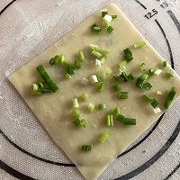 盖上一张云吞皮,以此类推,至两个葱油饼的云吞皮用完;