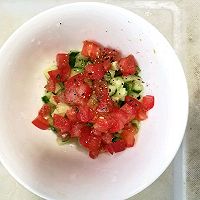 番茄和黄瓜切6mm左右的小丁,加入柠檬汁,盐和黑胡椒,橄榄油腌渍一下。这一步一定要有,和直接放味道有本质区别。