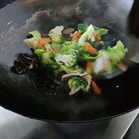 放入西兰花爆炒5分钟,加入少量的水、黑木耳、香菇爆炒3分钟。