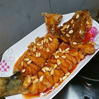 另起锅,放入适量白醋,白砂糖,番茄沙司,适量清水,待开了起大泡,放入水淀粉勾芡,淋在鱼身上即可。最后放上松子仁!!一定要趁热吃哦。