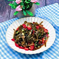 海带丝500g、红椒少许、蒜末少许、香葱少许、醋30g、生抽20g、食用油少许