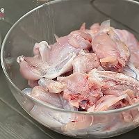 牛蛙剁去爪子,剁成适口大小,用盐5g、味精1g、糖2g、白胡椒粉3g、料酒20g、葱段、姜条抓匀,腌制30分钟。