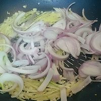 准备食材。髫丝洗净切成7cm长,用1大匙料酒拌匀去腥,炒前沥干。洋葱切丝,茭白切细丝,生姜去皮切细丝,蒜头剥好,拍碎切小粒。小香葱,葱白部分切7cm的段,剩下的葱,切成葱末