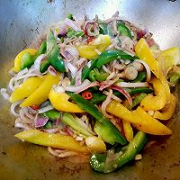 煎牛仔骨的余油中放入辣椒、葱姜蒜爆香,先下洋葱翻炒一会,再倒入彩椒继续翻炒至8成熟。