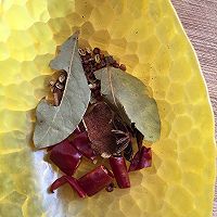 牛排一根、生姜1块、茴香、八角、桂皮、桂叶、花椒、红辣椒、大蒜、小葱、料酒2勺、味极鲜5勺、醋1小勺、蚝油3勺