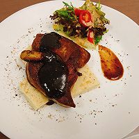 食材: 鹅肝两小块、黑椒酱适量、黄油适量、面包一片、沙拉少许 步骤3: 摆盘!左边滴一些黑胡椒将到盘子上后用勺子快速划过,再摆上装饰的沙拉即可 步骤4: 同理可制成草莓鹅肝,将草莓竖着切片盘子稍热码放均匀再撒上少许欧芹碎和现磨的胡椒粉海盐点缀,清新爽口值的尝试!