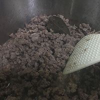 牛肉馅(我的放在冰箱冻了,所以用水煮开,放香叶,大料去腥味)煮至收汁,同时准备其他辅料