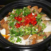 最后将剩下的肥肠放在豆腐上,再略笃一会,洒上香菜末与葱花,加少许味精提鲜;