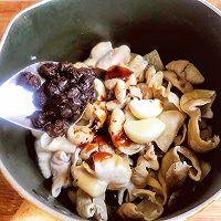 在大肠中加入蚝油,生抽,老抽,豆豉,蒜瓣,料酒,糖,盐拌匀