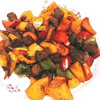 食材: 牛里脊200g、红彩椒1/3个、黄彩椒1/3个、生抽1匙、盐1勺、油3勺、葱1颗、黑胡椒适量、淀粉适量、尖椒一个 步骤1: 牛肉洗净切粒,用料酒.盐.黑胡椒.生抽.淀粉抓至均匀腌制20分钟 步骤2: 彩椒切块 步骤3: 葱切段,尖椒切块 步骤4: 锅中热油,放尖椒葱段爆锅,出香味后放牛肉,牛肉八分熟时放彩椒,加一点盐翻炒,待牛肉熟后出锅 步骤5: 不喜欢辣味的可以不放尖椒哦