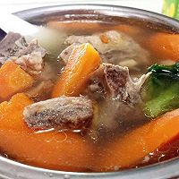 食材: 龙骨(可以有猪尾巴)250克、姜3片、干贝5粒、枸杞10粒、胡萝卜1根 步骤1: 切好龙骨和姜 步骤2: 龙骨和姜焯水,开水沸腾3分钟 步骤3: 胡萝卜切块,干贝枸杞,还有小块当参 步骤4: 均匀放入高压锅内,加水,水量刚好盖过食材就好 步骤5: 高压锅气压阀旋转转小火,18分钟后完成~