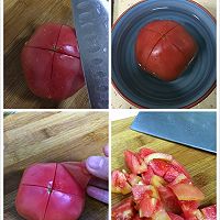 番茄洗净,用刀在上面划上十字,放入开水中烫2分钟,然后取出剥皮、切块备用。
