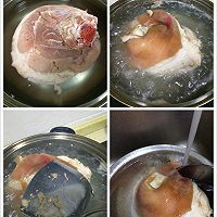 在锅中倒入凉水下肘子,焯水使肘子内的血沫随着水温上升吐净。然后撇去浮末,将焯好水的猪肘子捞出,然后用冷水冲洗干净备用。