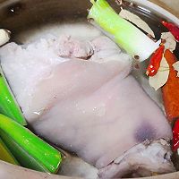 肘子焯水,去掉血水。洗净后放入高压锅,加入1500g清水,下入葱段、姜片、蒜瓣、花椒、八角、桂皮、香叶、干辣椒、白酒,大火煮开。