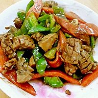 腰花卷曲微熟,就加一点儿盐(汤汁微咸),然后倒入调好的比较浓的芡汁(淀粉+很少的水),大火迅速翻炒,至芡汁包裹住腰花,放入青椒、胡萝卜。