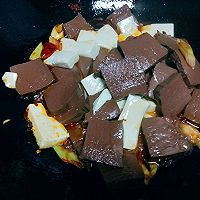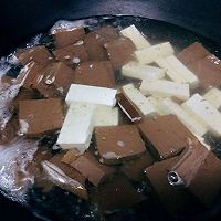 锅里水开放入切好的鸭血和豆腐,倒少许料酒和盐去腥。