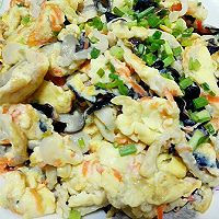 白玉菇半盒、蟹味菇半盒、黑木耳1把、胡萝卜1根、鸡蛋4个、食用油适量、盐适量、白胡椒粉适量