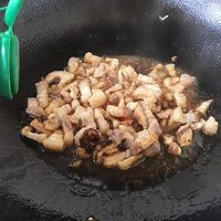 热锅凉油,放入猪肉肉丁,略微煸炒,煸炒出油花即可。