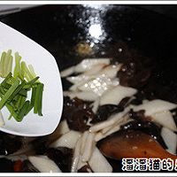 在锅中倒入油,放入姜丝爆香后先放入山药翻炒两三分钟,然后放入木耳,倒入用黄酒泡过的枸杞。黄酒也一同倒入。翻炒两分钟。