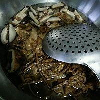 香菇切条,用热水焯一下两种蘑菇,2分钟,挤干水分备用。