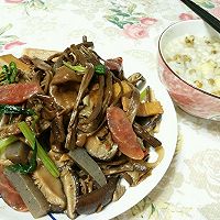 干茶树菇,干香菇各50克、生抽少许、蚝油少量、姜适量、葱(只要葱白部分)少许、洋葱半头、大蒜5粒、芹菜2根、腊肠2根、豆腐干适量、魔芋块半块、泡蘑菇的水1碗