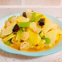 快出锅前放入藕带和芹菜段儿,翻炒一会儿加入盐调味儿