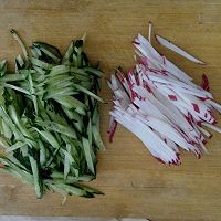 食材: 黄瓜一根、水萝卜一个、蒜适量、生抽适量、盐适量、醋适量、鸡精适量、香油适量 步骤1: 先切丝,不要太细(⊙o⊙) 步骤2: 切些蒜末,然后放盐,鸡精,生抽,醋,一点香油,即可! 步骤3: 拌起来就可以啦~~吃腻肉肉了,吃它特爽口且简单好看