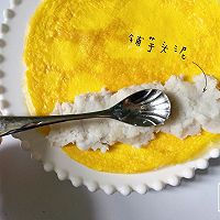 将煎好的蛋皮放在盘子或者砧板上,然后用小勺将芋头泥铺在靠近自己一侧的蛋皮上。用勺背压实一点。