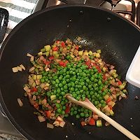 这边大概蔬菜下锅两三分钟吧,倒入青豆继续炒