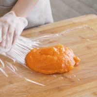 将柿子头朝下,尾朝上包上白豆沙,稍稍搓圆