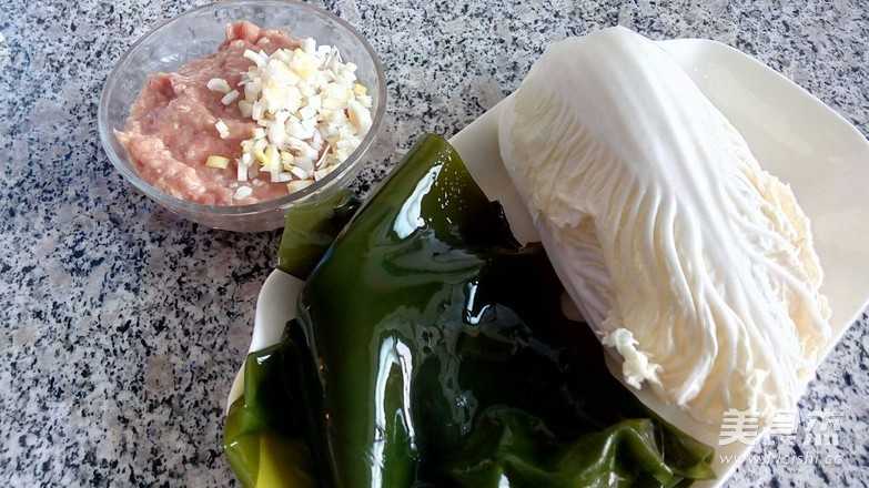 春天正是海带大量上市时,海带营养丰富,老少皆宜。 主料 肉馅200克 白菜1棵 海带200克 辅料 蚝油1小勺 精盐少许 酱油少许 白糖少许 料酒1小勺 白胡椒少许 葱白少许 鸡精少许 白菜海带丸子汤的做法 1.猪肉切片剁碎 2.放入料酒.蚝油.姜末 3.拌均加入盐.糖.胡椒粉顺一个方向搅拌,添少许水继续搅拌,最后添玉米淀粉。 4.葱末放上边,等下锅时加少许香油搅拌 5.海带事先煮好 6.改刀白菜.海带切丝 7.炒勺放油.虾皮小火煸炒放葱花炒出香味放蚝油和白菜,大火炒出水分盛出备用。 8.锅中放入开水,取一个小勺,用虎口挤入丸子放入锅中。 9.丸子漂浮上来,下海带丝。 10.煮两分钟下白菜丝,炖的时间自行掌握。