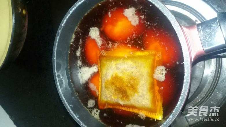 网上购买的卤料包很给力,不用准备那么多调味料,让卤蛋变的很简单! 主料 鸡蛋7个 辅料 水500毫升 卤料包1包 料酒少许 生抽3勺 老抽1勺 冰糖适量 卤蛋的做法 1.鸡蛋煮熟剥壳。 2.加卤料包,加水煮开。 3.加料酒、生抽、老抽、冰糖,煮15分钟。 4.关火晾凉,用牙签在蛋上扎孔,浸泡一天。 烹饪技巧 浸泡时间长一点入味。