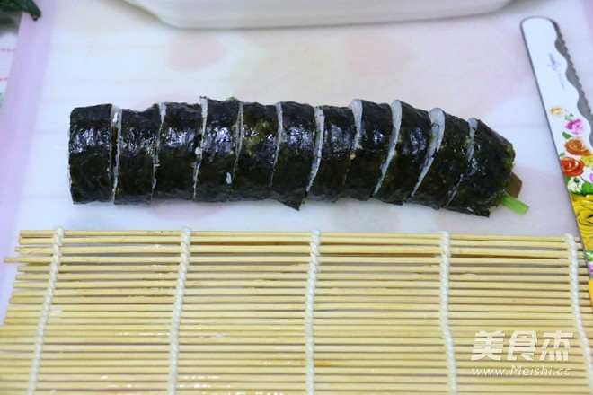 9.利用竹帘包成饭卷,末尾紫菜边边要捏紧。