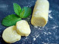 准备一些干粉(用低筋粉)大概40~50g左右,将发好的面团取出排气,再重新揉匀,用手将面团拍扁,撒上干粉;
