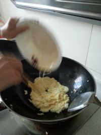 油热后,倒入鸡蛋,并用筷子不停搅拌,使之不成大块,这步很重要,影响蛋的蓬松效果