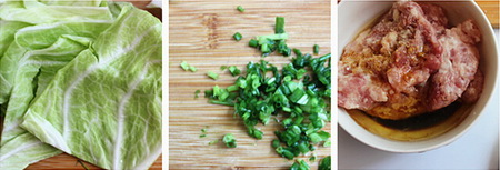 7-8、焯过水的菜叶平铺在案板上,放上肉馅,小心卷起。