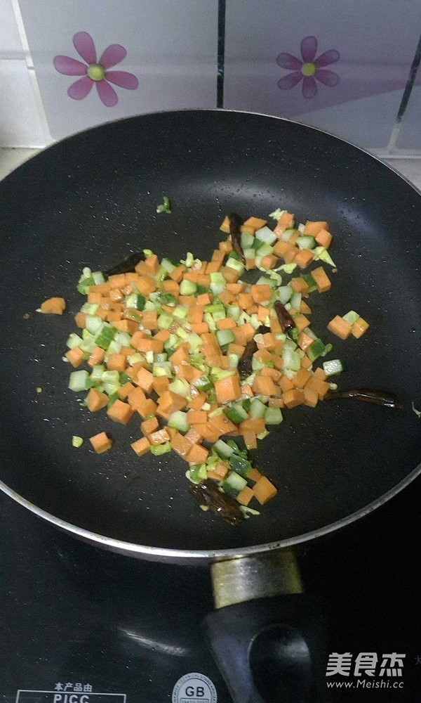 8.所有辅料炒好后加入事先炒好的鸡肉丁,继续翻炒