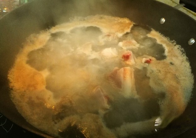 7.锅中放入1kg食用油,烧至8成热,下入排骨,大火炸制1分钟即可捞出