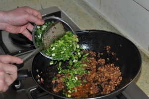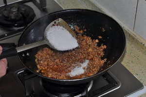 3、剁好的猪肉下锅加入料酒后快速炒散至吐油出香