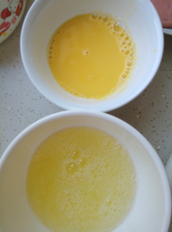 2.蛋清和蛋白分开,加适量水和盐,搅匀